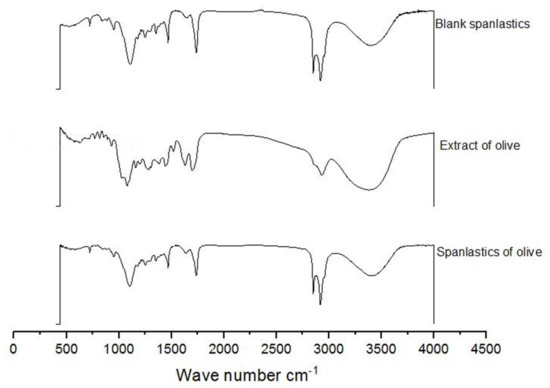 FTIR spectra of blank spanlastics, olive extract, and spanlastics of olive.