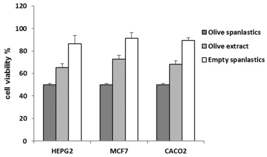 Cell viability of olive spanlastics and empty spanlastics against HepG-2. MCF-7, and Caco-2.