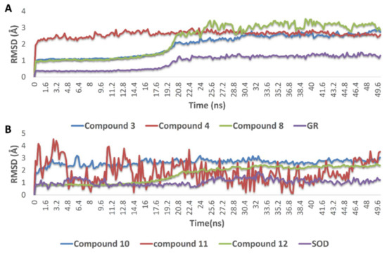 (A) RMSDs of compounds 3, 4, and 8 inside the active site of GR, and compounds 10, 11, and (B) 12 inside the active site of SOD over 50 ns of MDS.
