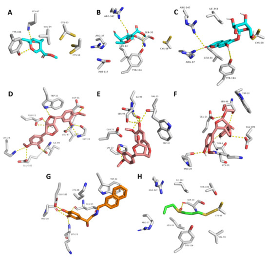 Binding mode of compounds 3, 4, and 8 inside the active site of GR ((A–C), respectively; brick-red-colored), Scheme 10, 11, and 12 ((D–F), respectively; brick red-colored structures) inside the active site of SOD, in addition to the binding mode of SOD and GR co-crystalized ligands ((G) and (H), respectively).