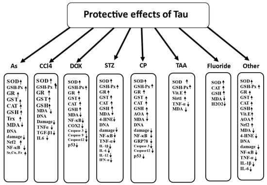 To address the antioxidant actions of Tau, it is necessary to choose proper model systems which would provide conclusive evidence related to potential molecular mechanisms of the protective action of the compound. Our idea was to use data accumulated when a search for effective antioxidants to decrease the toxic effect of various commonly used chemicals was conducted. The choice of toxic compounds of interest was associated with their proven prooxidant properties. Therefore, first of all, we chose data on arsenic (As) and carbon tetrachloride (CCl4), both of which are important human health hazards. Secondly, we used thioacetamide (TAA) and fluoride, chemicals possessing hepatotoxicity. Thirdly, we chose cisplatin (CP), doxorubicin (DOX) and streptozotocin (STZ), chemotherapy drugs with substantial side effects, including nephrotoxicity, cardiotoxicity and diabetes promotion. All of the aforementioned chemicals were clearly proven to impose oxidative stress by means of the downregulation of various parts of the antioxidant defence network. Finally, we looked at other toxic elements with proven prooxidant activities [199,200]. In general, accumulating evidence confirms the importance of oxidative stress as an important mechanism of chemical hepatotoxicity [201]. Therefore, the toxic compounds were employed in a variety of experimental models to study the antioxidant properties of Tau. It has been shown that Tau can protect cultured cells, organs and mammalian species against the detrimental consequences of oxidative stress imposed by various chemical agents, biochemical, drugs, toxins and disease states. A summary of recent findings is presented below.