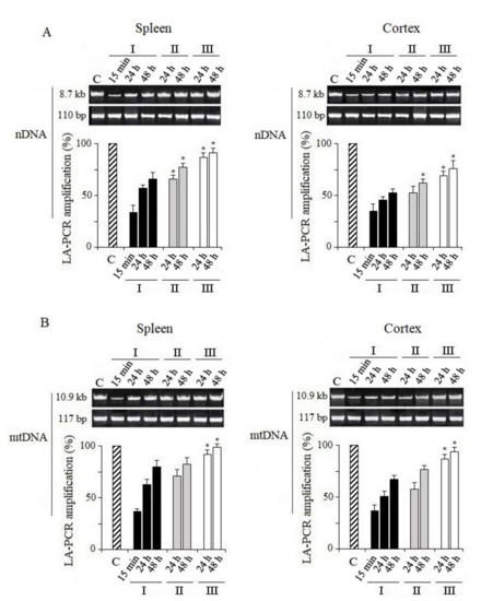 2. The amplification products of long sections of nDNA and mtDNA from the tissues of unirradiated mice were taken as 100% control. It can be seen that the level of synthesized products of nDNA and mtDNA LA-QPCR from the mice’s spleens and cerebral cortexes 15 min after irradiation was significantly lower than that of the unirradiated mice (Figure 1). Such a reduction in LA-QPCR products indicates that these amplifiable areas of nDNA and mtDNA contained damages capable of blocking KAPA Long Range Rapid PCR DNA polymerase (KAPA Biosystems, Wilmington, MA, USA). The preservation of low levels of amplification of nDNA and mtDNA regions indicates the presence of non-repaired damages in them. However, there was an increase in LA-QPCR products by 24 and 48 h post-radiation time, which indicates the functioning of DNA damage repair processes. According to the results obtained, nDNA and mtDNA from the tissues of mice treated with MEL before IR-radiation and after irradiation had significantly less damages capable of blocking KAPA Long Range DNA polymerase. As can be expected, this shows that MEL contributes to the DNA damage reduction (Figure 1). nDNA and mtDNA from the tissues of mice treated with MEL before irradiation and after irradiation had significantly less damages capable of blocking KAPA Long Range DNA polymerase. As can be expected, this also shows that MEL contributes to the DNA damage reduction. The results obtained show that the nDNA repair occurs more actively in the spleen and cerebral cortex tissues of mice treated with MEL after irradiation. When comparing the LA-QPCR amplification data of nDNA from two tissues of mice irradiated and treated with MEL, it seems that the nDNA repair in the spleen tissue for the indicated periods of post-radiation time was more active than in the cerebral cortex (Figure 1).