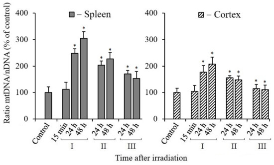Ratio of mtDNA/nDNA in the tissues of the spleen and cerebral cortex of mice after their irradiation. The y-axis shows the percentage (%) of the change in mtDNA to nDNA ratio relative to control. The numbers (15 min, 24 h, 48 h) on X-axis indicate the time after irradiation. I—mice without MEL administration; II—MEL administration before irradiation; III—MEL administration after irradiation. The data are presented as mean ± SEM of 5–6 independent experiments. Statistical significance was set at * p < 0.05.
