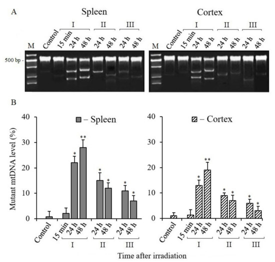 Detection of mtDNA mutant copies of spleen and cerebral cortex tissues in mice 15 min, 24, and 48 h after X-ray irradiation. (A) Electrophoresis of cleavage products obtained by Surveyor nuclease digestion of heteroduplexes of mtDNA PCR amplicons from spleen and cerebral cortex tissues. (B) Percentage of Surveyor nuclease cleaved heteroduplexes of PCR amplicons of mtDNA (ND3 gene, 534 bp). I—mice without MEL administration; II—MEL administration before irradiation; III—MEL administration after irradiation. The data are presented as mean ± SEM of 5–6 independent experiments. Statistical significance was set at * p < 0.05, ** p < 0.01.