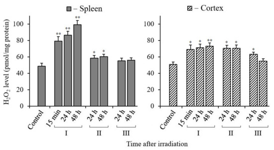 Changes in the H2O2 content in spleen and cerebral cortex tissues of mice 15 min, 24, and 48 h after their exposure to X-rays. I—mice groups without MEL administration; II—MEL administration before irradiation; III—MEL administration after irradiation. The data are presented as mean ± SEM of 5–6 independent experiments. Statistical significance was set at * p < 0.05; ** p < 0.01.