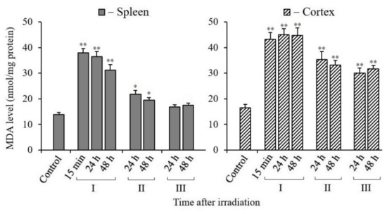 Changes in the MDA content in spleen and cerebral cortex tissues of mice 15 min, 24, and 48 h after their exposure to X-rays. I—mice without MEL administration; II—MEL administration before irradiation; III—MEL administration after irradiation. The data are presented as mean ± SEM of 5–6 independent experiments. Statistical significance was set at * p < 0.05, ** p < 0.01.