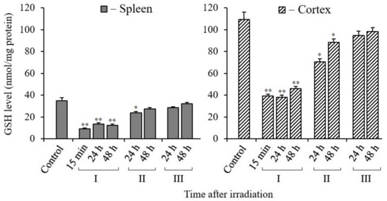 Changes in the GSH in spleen and cerebral cortex tissues of mice 15 min, 24, and 48 h after their irradiation. I—mice without MEL administration; II—MEL administration before irradiation; III—MEL administration after irradiation. The data are presented as mean ± SEM of 5–6 independent experiments. Statistical significance was set at * p < 0.05, ** p < 0.01.