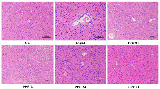 Histopathological observation of liver in the mice injured by d-galactose. NC, normal control group; d-gal, d-galactose model group; EGCG, 10 mg/kg b.w./day epigallocatechin gallate; PPF-L, 10 mg/kg b.w./day P. lactiflora flavonoids extract; PPF-M, 20 mg/kg b.w./day P. lactiflora flavonoids extract; PPF-H, 40 mg/kg b.w./day P. lactiflora flavonoids extract.