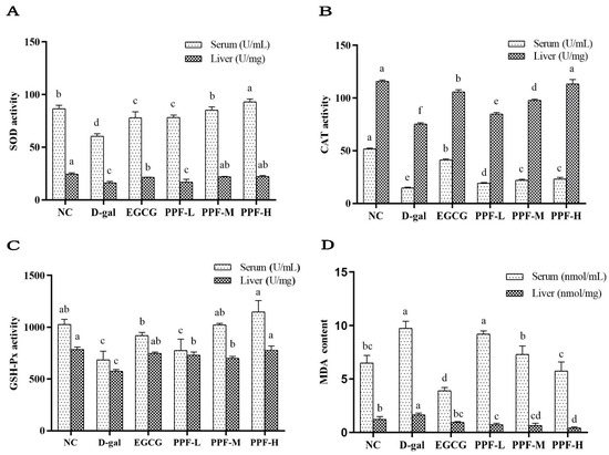 SOD activity of serum and liver in the d-gal group was significantly lower than that in the NC group, indicating that the d-gal-induced oxidative stress model was constructed successfully. SOD activity of serum in the PPF-L, PPF-M, and PPF-H groups and the EGCG group significantly increased in a concentration-dependent manner compared with the d-gal group (p < 0.05). There was no significant difference in the SOD activity of the liver between the PPF-L group and the d-gal group. In contrast, SOD activity significantly increased in the PPF-M group and PPF-H group (Figure 2A).