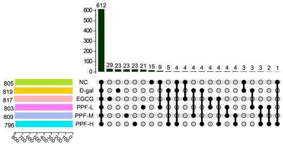 16S rRNA gene sequencing was used to analyze the structure of gut microbiota in the cecum of mice. Samples in different groups had specific characteristics and commonalities. This research group compared the common and unique OTU situations of the six treatment groups, as shown in Figure 3, the six treatment groups had a total of 612 common OTUs, the NC group had 15 unique OTUs, the d-gal group had 23 unique OTUs, and the EGCG group had unique 29 OTUs. The doses of PPF-L, PPF-M, and PPF-H had 21, 23, and 23 unique OTUs, respectively.