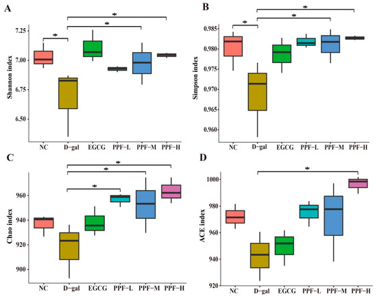 The alpha diversity of gut microbiota is shown in Figure 4. The Shannon index (6.68 ± 0.29), Simpson index (0.968 ± 0.009), and Chao index (917.43 ± 22.31) in the d-gal group were significantly lower than those in the NC group (p < 0.05), indicating that the richness and uniformity of gut microbiota decreased significantly after mice experienced oxidative stress. The alpha diversity index of the different dose PPF groups was higher than that of the d-gal group, and especially the PPF-H group had the highest alpha diversity. Interestingly, the ACE index of the PPF-H group was significantly higher than that of the EGCG group. Based on the above data analysis, it could be seen that d-gal-induced oxidative stress mice could significantly increase the diversity of gut microbiota after being fed PPF.