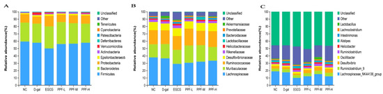 Composition of gut microbiota at different taxa levels. (A) Phylum-level; (B) Family- level; (C) Genus -level.