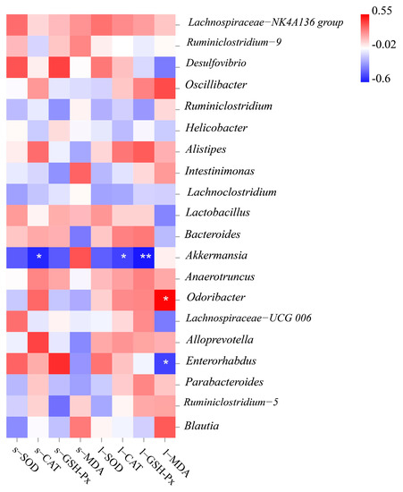 We performed correlation analysis between the genus level of gut microbiota and oxidative stress biomarkers in six treatment groups, to evaluate the potential link between significantly altered taxa in the gut microbiota and oxidative stress-related parameters (Figure 7). Among the top 20 bacterial genera listed, three genera were significantly related to oxidative stress biomarkers in serum and liver. Akkermansia was negatively correlated with CAT activity in serum or liver, GSH-Px activity in the liver. Enterorhabdus was significantly negatively correlated with MDA content, and only Odoribacter was significantly positively correlated with MDA content in the liver.