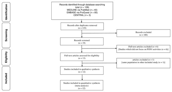 Figure 1 shows the flow for the selection of literature that reported PON1 activity of patients with COPD. Of the 119 initially identified articles, 100 articles were excluded after screening of titles and abstracts. After screening of full-texts, six studies were excluded because six studies did not focus on PON1 activity of patients with COPD [22,23,24,25,26,27]. One study [28] was excluded because it included the same population as another study [29]. Finally, 12 studies were identified [13,14,28,29,30,31,32,33,34,35,36,37].