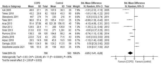 Forest plot of paraoxonase activity in all studies. COPD: chronic obstructive pulmonary disease; Std: standard; SD: standard deviation; CI: confidence interval; IV: interval variable.