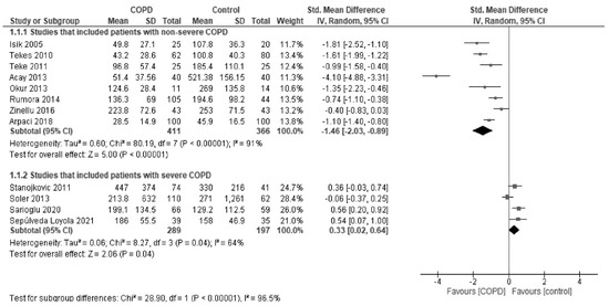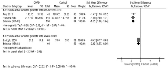 Meta-analyses were performed using random-effects models in Review Manager 5.4.1 (RevMan 2020, The Nordic Cochrane Centre, Copenhagen, Denmark) [20]. The standard mean difference (SMD) and 95% confidence interval (CI) of paraoxonase and arylesterase activity were calculated. When missing data existed, standard deviations were calculated based on the methods of the Cochrane handbook [21]. Statistical heterogeneity was evaluated by visual inspection of forest plots and by calculating the I2 statistic (I2 values of 0% to 40%: May not be important; 30% to 60%: May represent moderate heterogeneity; 50% to 90%: May represent substantial heterogeneity; 75% to 100%: Considerable heterogeneity) [21]. When heterogeneity was identified (I2 statistic > 50%), the possible source of heterogeneity was examined in subgroup analyses of the severity of COPD (studies including severe COPD versus studies of mainly non-severe COPD). In the respective studies, the severity of COPD was defined according to Global Initiative for Chronic Obstructive Lung Disease criteria (https://goldcopd.org/ (accessed on 25 November 2021)) based on spirometry, symptoms, and exacerbations [21].