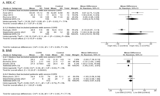 Forest plot of (A) high-density lipoprotein cholesterol and (B) body mass index stratified by the severity of COPD.