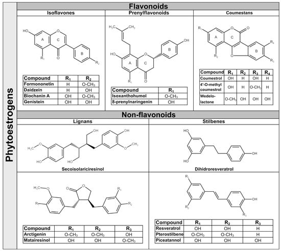 In the past decades, the research regarding the beneficial or adverse effects of phytoestrogens present in the human diet has intensified, due to their estrogenic or anti-estrogenic potential in humans and animals [1,2,3]. Phytoestrogens are found in a wide variety of foods, including soy-based products, fruits, vegetables and dairy products [4,5,6]. A huge list of health benefits, including a reduced risk of osteoporosis, hormone-dependent cancers, cardiovascular diseases and brain disorders, as well as decreased menopause symptoms, is often ascribed to phytoestrogens. However, they can act as endocrine disruptors, being able to induce adverse health effects, as well [7,8]. Based on their presumptive beneficial effects on human health, the amount of phytoestrogens consumed in the daily diet has increased considerably worldwide [9,10]. Nowadays, a plethora of dietary supplements based on phytoestrogens has overflowed the market, and their consumption has reached high levels, especially within the female population. Thus, there is a growing need for relevant scientific data regarding their impact on human health.