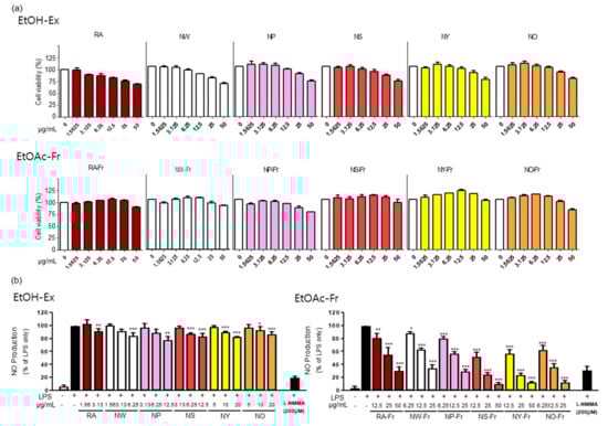 To investigate the potential antioxidant and anti-inflammatory effects of P. nudicaule and P. rhoeas, we first checked the cytotoxicity of each EtOH extract and EtOAc fraction of both plants in RAW264.7 cells. As shown in Figure 1a, the EtOAc fractions of the plants were generally less toxic than their corresponding EtOH extracts. The EtOAc fractions were not cytotoxic up to 25 μg/mL (NW-Fr, NP-Fr, and NO-Fr) and 50 μg/mL (RA-Fr, NS-Fr, NY-Fr), whereas the EtOH extracts were harmless up to 3.125 μg/mL (RA), 6.25 μg/mL (NW), and 12.5 μg/mL (NP, NS, NY, and NO). Based on these results, the non-toxic concentrations of each EtOH extract and EtOAc fraction of the plants were used for further investigation.