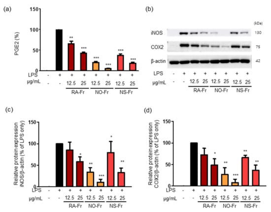 Since iNOS is responsible for certain cytokine- or microbial product-mediated NO production and NO is known to increase prostaglandin production via the COX pathway in macrophages [30,31], we examined the effects of RA-Fr, NO-Fr, and NS-Fr on the LPS-induced expression of PGE2, COX2, and iNOS in RAW264.7 cells. As shown in Figure 2a, all EtOAc fractions significantly reduced LPS-induced PGE2 in a dose-dependent manner. In addition, every fraction suppressed the LPS-induced expression of iNOS and COX2 (Figure 2b–d) as expected. In particular, NO-Fr was the most effective in reducing LPS-induced PGE2, iNOS, and COX2, similar to the suppression of LPS-induced NO. Together, these results suggest that the EtOAc fractions of both P. nudicaule and P. rhoeas might be potent antioxidants and anti-inflammatory agents.