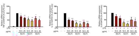Effects of ethyl acetate (EtOAc) fraction of Papaver rhoeas red (RA-Fr), Papaver nudicaule orange (NO-Fr), Papaver nudicaule scarlet (NS-Fr) on the expression of TNFα, IL-1β and IL-5. RAW264.7 cells were treated with each EtOAc fraction (12.5 and 25 μg/mL) and LPS (5 ng/mL) for 4 h. The expression level of each mRNA was analyzed by normalization to the GAPDH levels. Data are shown as mean ± standard error of the mean (SEM). * p < 0.05, ** p < 0.01 and *** p < 0.001 imply statistically significant differences compared with the LPS only treated group.