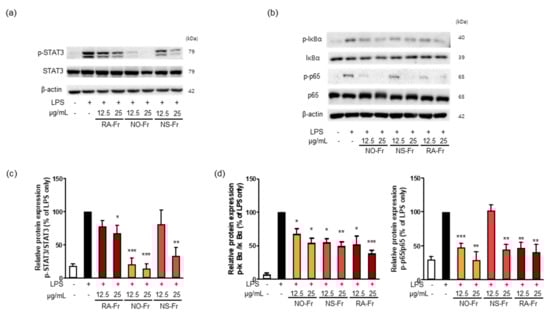 To further elucidate the anti-inflammatory effects of EtOAc fractions of P. nudicaule and P. rhoeas and their mechanism of action, we examined mRNA expression levels of proinflammatory cytokines IL-1β, IL-6, and TNF-α. As shown in Figure 3, NO-Fr, NS-Fr, and RA-Fr effectively reduced the LPS-induced mRNA expression of IL-1β, IL-6, and TNF-α, indicating that these cultivars could regulate the expression of these genes at the transcriptional level. NF-κB and STAT3 are transcription factors that regulate the expression of the proinflammatory cytokines as well as COX2 and iNOS [28,32,33]. In addition, TNF-α and IL-6 activate NF-κB and STAT3 signaling pathways [34]. Thus, we investigated the effects of NO-Fr, NS-Fr, and RA-Fr on LPS-induced activation of NF-κB and STAT3. As shown in Figure 4a,c, the aforementioned cultivars suppressed the LPS-induced phosphorylation levels of STAT3, but had no effect on the expression of STAT3, indicating EtOAc fractions of the plant-mediated inactivation of STAT3. They also reduced the LPS-induced phosphorylation levels of IκBα and p65, indicating EtOAc fractions of the plant-mediated inactivation of NF-κB. These results suggest that the EtOAc fractions of both P. nudicaule and P. rhoeas exert their anti-inflammatory effects in LPS-stimulated macrophage cells by inhibiting NF-κB and STAT3.