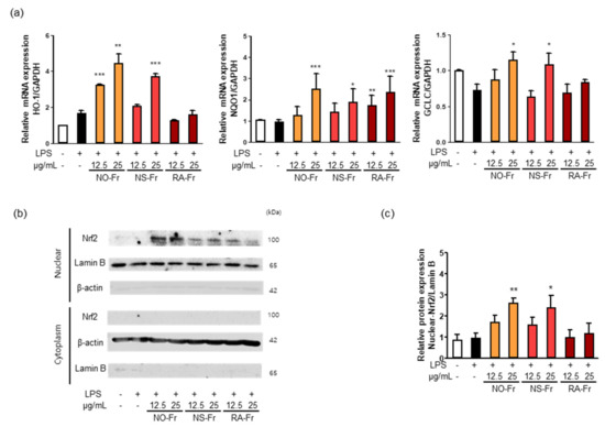 Nrf2 signaling plays a vital role in intracellular antioxidant systems, including HO-1, NQO1, and GCLC [9,10,11]. Thus, we further investigated the mechanism by which NO-Fr, NS-Fr, and RA-Fr induced the antioxidant effects. As shown in Figure 6a, NO-Fr and NS-Fr increased the mRNA expression levels of HO-1, GCLC, and NQO1, and RA-Fr increased the expression of NQO1 in LPS-stimulated RAW264.7 cells. As the expression of antioxidant regulators is regulated by Nrf2 [8,9,11], we examined the expression of Nrf2 in the cytoplasm and nucleus of LPS-stimulated cells and found that NO-Fr and NS-Fr significantly increased Nrf2 expression in the nucleus but not in the cytoplasm, while RA-Fr had no effect on the expression of Nrf2 in both the cytoplasm and nucleus (Figure 6b,c). These results suggest that the EtOAc fraction of P. nudicaule exerts antioxidant effects via the Nrf2-mediated induction of antioxidant genes, whereas the EtOAc fraction of P. rhoeas had an Nrf2-independent increase in NQO1.