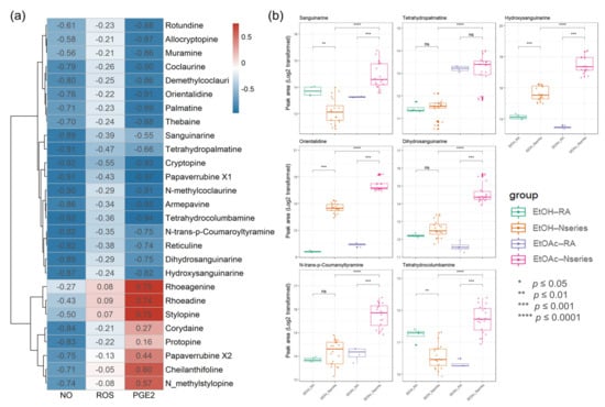 A heat map of bioactive correlation of identified metabolites from ethanol (EtOH) extracts and ethyl acetate (EtOAc) fractions of P. nudicaule and P. rhoeas. Each value in the heat map is a colored representation of a calculated Pearson correlation coefficient of metabolites with NO, ROS, and PGE2. Red and blue colors indicate an increase and decrease of Pearson correlation values, respectively (a). The box plots show the differential peak area of significant seven metabolites analyzed using biochemometrics (b). * p ≤ 0.05, ** p ≤ 0.01, *** p ≤ 0.001, and **** p ≤ 0.0001; EtOAc fraction of P. rhoeas (EtOAc-RA) vs. EtOAc fractions of P. nudicaule (EtOAc-N series), EtOH extract of P. rhoeas (EtOH-RA) vs. EtOH extract of P. nudicaule (EtOH-N series), and EtOH-N series vs. EtOAc-N series.