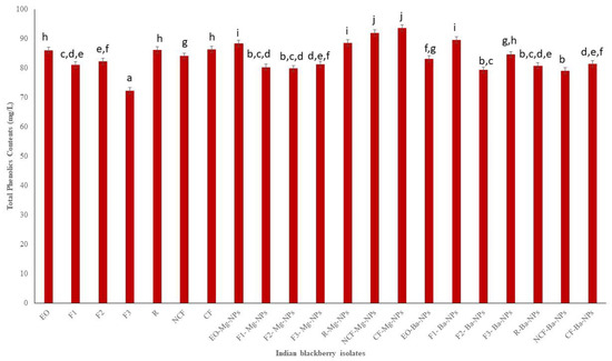 Total phenolics contents (TPC) of Indian blackberry isolates. Different letters on the bar of the graph indicate the significantly different (p < 0.05) within essential oil, fractions, and nanoparticles.