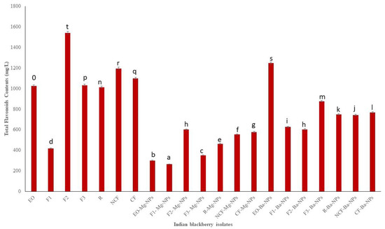 Total flavonoids contents (TFC) of Indian blackberry isolates. Different letters on the bar of the graph indicate the significantly different (p < 0.05) within essential oil, fractions, and nanoparticles.