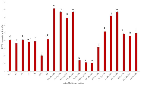 DPPH scavenging activity of Indian blackberry isolates. Different letters on the bar of the graph indicate the significantly different (p < 0.05) within essential oil, fractions, and nanoparticles.