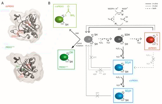 Structural and redox state insights of PRDX5. (A) Crystal structures of recombinant human PRDX5 (upper, PDB ID: 2vl3) and mutated C47S PRDX5 (lower, PDB ID: 1urm), showing that changes in Cys redox state is accompanied by conformational changes. dsPRDX5 contains three Cys (C47, C72, C151), with two of them being catalytically active (C45 and C151). (B) Schematic of the PRDX5 C47 redox modifications. The PRDX5 C47 thiol (-SH) can be oxidized in vitro or in vivo to an intermediate sulfenic acid (-SOH) by H2O2 or other peroxides. The reactive -SOH either engages into an intramolecular disulfide bond with C151 (dsPRDX5, red) or is hyperoxidized in vitro to sulfinic acid (-SO2H) or further to sulfonic acid (-SO3H) (s/sPRDX5, blue). In vivo, the disulfide bridge is reduced by thioredoxin (Trx). Unlike typical 2-Cys PRDXs, the PRDX5 sulfinic form cannot be reduced by the sulfiredoxin system. Both Cys sulfinic and sulfonic acids are therefore irreversible. In vitro, DTT can be used to reduce the disulfide form, but not the hyperoxidized forms. To maintain the protein in a reduce state, the thiol can be alkylated by iodoacetamide (IAM) to prevent re-oxidation (r/aPRDX5, light green), or the protein can be point-mutated to replace the C47 by a serine (PRDX5C47S, dark green).