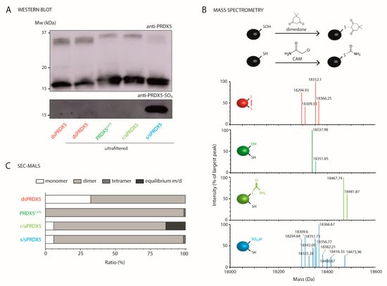 Next, we characterized the PRDX5 redox forms using various approaches (Figure 2). Western blot analysis (Figure 2A) first revealed that dsPRDX5 showed similar bands before and after ultrafiltration, indicating that the ultrafiltration process used to remove the residual agents after the chemical treatments does not alter the proteins. We then confirmed that DTT/H2O2 treatment led to at least partial hyperoxidation of PRDX5 Cys by comparing similar blots probed either with an antiserum raised against recombinant human PRDX5 or an antibody highly specific for the sulfonated PRDX5 form [21].