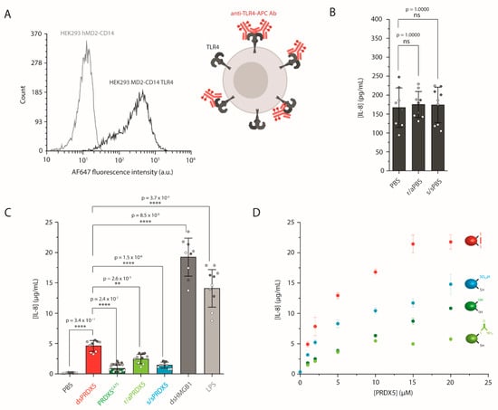 Our previous study showed that dsPRDX5 was able to stimulate IL-1 secretion from PMA-differentiated THP-1 cells [19]. To demonstrate the direct role of TLR4 in PRDX5-triggered cytokine secretion, we examined the IL-8 production from HEK293 MD2-CD14 transfected with TLR4 cells using ELISA (Figure 3). We first used FC to validate the stable transfection and to confirm that the receptor was expressed at the cell surface (Figure 3A). We also established that the receptor was functional by exposing the cells to LPS, which requires both MD-2 and CD14 to trigger cytokine secretion [45,46,47] (Figure 3C). LPS exposure resulted in a secretion of 14,085 2401 pg·mL−1 (mean SDpooled, N = 3).