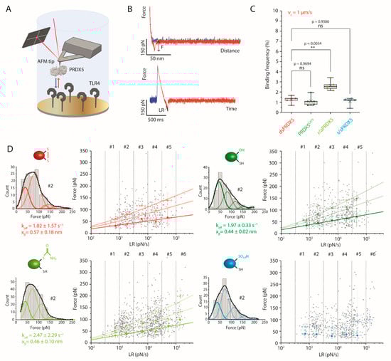 We previously demonstrated with AFM-based SMFS that dsPRDX5 was able to specifically interact with TLR4 [19]. To determine whether the difference in the cytokine-inducing capability of the PRDX5 redox forms could originate from differential binding properties to TLR4, we used AFM-based SMFS to probe the interaction between the PRDX5 redox forms and TLR4 (Figure 4A). To this end, we covalently grafted the PRDX5 redox forms to AFM tips by means of a flexible polyethylene glycol (PEG24) linker, and we covalently attached TLR4 molecules to a mixed self-assembled monolayer of carboxyl- and hydroxyl-terminated alkanethiols immobilized onto an inert gold surface using N-hydroxysuccinimide (NHS)/N-(3-dimethylaminopropyl)-N′-ethylcarbodiimide hydrochloride (EDC) chemistry. We then used force-distance (FD) curve-based AFM to investigate the binding kinetics of the PRDX5 redox forms (Figure 4B, Supplementary Figure S5A). We recorded multiple maps (30 for dsPRDX5, PRDX5C47S and r/aPRDX5; 35 for s/sPRDX5) at different tip retraction speeds (100 nm·s−1, 200 nm·s−1, 500 nm·s−1, 1 µm·s−1, 2 µm·s−1, and 10 µm·s−1).