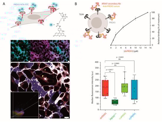 Binding of PRDX5 to the surface of HEK293 MD2-CD14 TLR4 cells monitored by fluorescence. (A) Cartoon (upper) showing the protocol used to detect PRDX5 binding to TLR4 using confocal. Confocal images of, left to right, PRDX5-NTA-FITC (cyan), TLR4-YFP (magenta), fluorescence overlay. Co-localization (white) of FITC (blue) and YFP (red) signals predominantly at the plasma membrane and in the endomembranous region. There is a lack of co-localization in the extracellular medium (*) and in YFP exclusive regions within cells (arrowhead). Co-localization map and scatterplot (inset). The cross-talk is represented by unique perfectly co-localized pixels. Scale bars are 10 µm. (B) Cartoon (upper) showing the protocol used to detect PRDX5 binding to living cells using flow cytometry (FC). Graph from FC binding assay showing the concentration dependence of dsPRDX5 binding to the surface of HEK293 MD2-CD14 TLR4 cells. Binding was normalized to the signal of untreated cells and is expressed relatively (in %) to the fluorescence intensity observed with 15 µM PRDX5. Three independent experiments with two replicates in each. Box blot (lower) from FC binding assay showing the median fluorescence intensity of PRDX5-treated cells. The fluorescence intensity was normalized to the untreated cells. Seven experiments with three independent protein treatments (white, light grey and dark grey points) or two protein productions in the case of PRDX5C47S. Three replicates for each redox form in each treatment. Box plot shows mean (×), median (–), 25th and 75th percentiles (boxes), and ranges from min to max (whiskers). ns, not significant (p > 0.05). ** p ≤ 0.01 (Tukey HSD test).