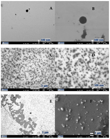 SEM micrographs of nanoparticles. (A,B). G-E (1:1); (C,D). L-E (1:1); (E,F). G-L-E (0.5:0.5:1).