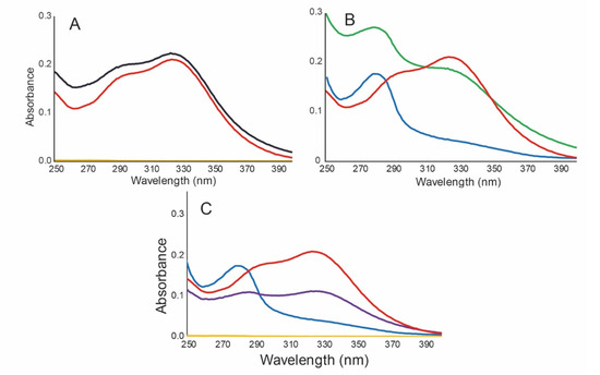 UV spectra of NPs and polymers 0.025 mg/mL in milliQ water. (A). Gelatin (yellow), B. antioquensis extract (red), and NP G-E (1:1) (black). (B). Lignin (blue), B. antioquensis extract (red) and NP L-E (1:1) (green). (C). Gelatin (yellow), B. antioquensis extract (red), Lignin (blue) and NP G-L-E (0.5:0.5:1) (purple).