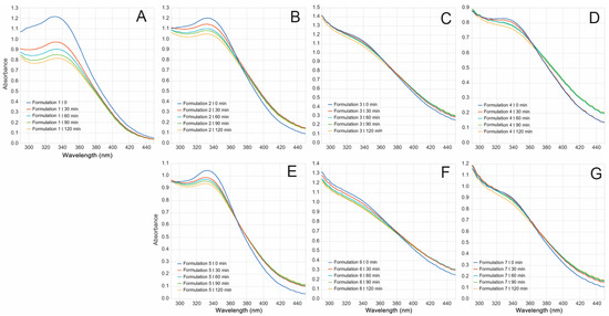 Photo-stability of B. antioquensis extract and NPs. UV-vis spectra before (blue) and after 30 min (red), 60 min (light blue), 90 min (green), and 120 min (yellow) under UVA-UVB irradiation. Average measurement of formulation: (A). F1; (B). F2; (C). F3; (D). F4; (E). F5; (F). F6; (G). F7 (See Table 5 for formulation details).