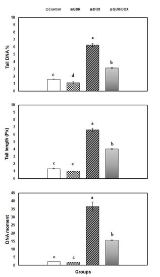 All comet parameters of both DOX and QUR/DOX groups remained significantly different from the corresponding ones from the control group, but the animals of the co-treated group presented significant reduction of values belonging to the three indices.