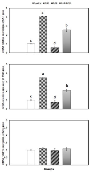 Relative expression of enzymatic antioxidant-related genes in spleen of rats in response to QUR administration (50 mg/kg bw for 15 days, orally) and/or DOX treatment (15 mg/kg bw in six injections over 2 weeks, IP). The expression pattern of genes mRNA was normalized against the internal control gene β-actin using qRT-PCR. Means with different superscripts (a,b,c,d) are significantly different (p < 0.05).