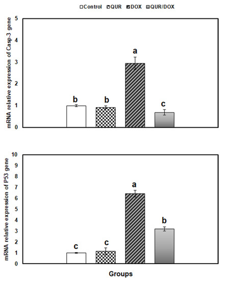 Relative expression of apoptosis-related genes in spleen of rats in response to QUR administration (50 mg/kg bw for 15 days, orally) and/or DOX treatment (15 mg/kg bw in six injections over 2 weeks, IP). The expression pattern of genes mRNA was normalized against the internal control gene β-actin using qRT-PCR. Means with different superscripts (a,b,c) are significantly different (p < 0.05).