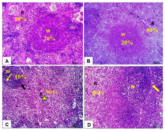 Representative histopathological photomicrographs of H&E-stained rat’s spleen. (A) Control showing: normal splenic parenchyma (red 80% and white pulps 20%); (B) QUR group showing normal splenic white (represents about 20%) and red pulps (represents about 80%); (C) DOX group showing shrinkage of lymphoid follicles, white pulp area with decrease in lymphocytes population (lymphocyte depletion) in the splenic periarteriolar lymphoid sheath (yellow arrow) and increased red pulp area (represents about 90%) (star); (D) QUR/DOX group showing somewhat normal spleen architecture with intact white pulp (W), red pulp (R) and densely cellular lymphocytes population in periarteriolar lymphoid sheath region (hyperplastic lymphoid elements in white pulps) (arrow). Scale Bar 50 μm.