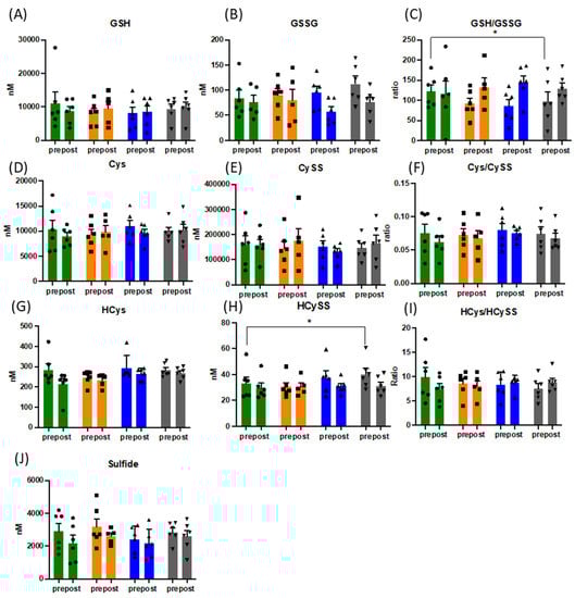 Changes in pattern of responses of the free thiol metabolome (A–J). Data presented for n = 6 before and after acute physiological challenge of a cardiopulmonary exercise test, presented as mean and SEM, with overlaid individual data (circles, squares, up- and downward triangles). Data presented in nM or concentration ratio. Green bars = baseline, orange bars = week 3, blue bars = week 6 and grey bars = week 12. Abbreviations: GSH: reduced gluthathione; GSSG: oxidised glutathione; Cys: cysteine, CySS: cystine; HCys: homocysteine, HCySS: homocystine, * = p < 0.05.
