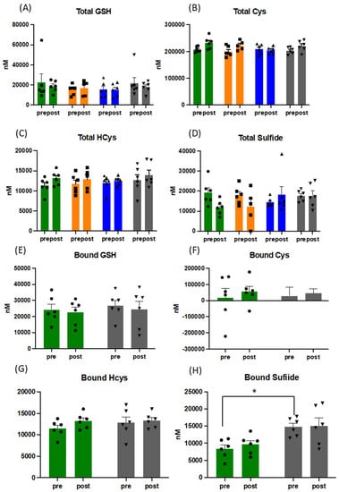 Pattern of response to changes in concentration of total and bound thiols in plasma (A–H). Data presented for before and after acute physiological challenge of a cardiopulmonary exercise test at each sampling point throughout the training intervention, presented as mean and SEM, with overlaid individual data (circles, squares and triangles; for the sake of direct comparison to free thiols, all concentrations are presented in [nM]). Green bars = baseline, orange bars = week 3, blue bars = week 6, and grey bars = week 12. Abbreviations: GSH: gluthathione; Cys: cysteine; HCys: homocysteine, * = p < 0.05.