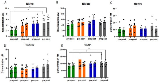 Pattern of redox responses to pre- and post-acute exercise challenge at each sampling point in study for plasma concentrations of nitrite (A), nitrate (B), nitroso species (C), TBARS (D) and FRAP (E), presented as mean and SEM, with individual data (circles, squares and triangles) overlaid. Data presented in µM or nM. Green bars = baseline, orange bars = week 3, blue bars = week 6, grey bars = week 12. Abbreviations: CPET: cardiopulmonary exercise test; RXNO: total nitroso species; TBARS: thiobarbituric acid reactive substances; FRAP: ferric reducing ability of plasma. * = p < 0.05.
