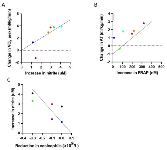Significant correlations (Spearman’s rho correlation) between improvements in physical fitness, increased redox capacity and inflammation. (A) A greater increase in maximum oxygen uptake is associated with a greater increase in pre-CPET nitrite from baseline (r = 0.943, p = 0.019), (B) a greater increase in oxygen uptake at AT strongly correlates with a larger increase in FRAP (r = 0.886, p = 0.019), and (C) a greater increase in pre-CPET nitrite significantly correlates with a greater reduction in peripheral blood eosinophil levels (r = −0.837, p = 0.038). Abbreviations AT: (oxygen uptake at) anaerobic threshold; FRAP: ferric reducing ability of plasma.