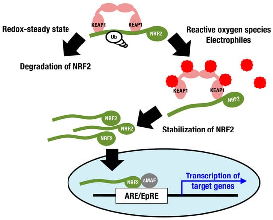 The KEAP1-NRF2 system as a defense mechanism against oxidative stress and electrophilic stress. Under a steady state with well-controlled redox balance, NRF2 is ubiquitinated and degraded. Reactive oxygen species and electrophiles inhibit KEAP1-dependent ubiquitination of NRF2, stabilizing NRF2 and resulting in consequent induction of NRF2 target genes. Red spiked circles indicate reactive oxygen species and electrophiles.