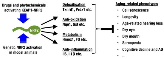 Beneficial impacts of NRF2 activation on aging-related phenotypes. When NRF2 is pharmacologically activated with drugs and phytochemicals or genetically activated in mice, various aging-related phenotypes are alleviated. NRF2 target genes are primarily involved in detoxification, antioxidant function, metabolism, and anti-inflammatory function.
