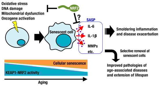 Oxidative stress increases during aging. As part of the DNA damage response, DNA damage foci are formed and significantly increase with age in the lung, spleen, dermis, liver, and gut epithelium [27]. Such DNA damage is a major trigger of cellular senescence, which is one of nine defined hallmarks of aging [28]. Cellular senescence is a cell state implicated in various physiological processes and a wide spectrum of age-related diseases [29]. In addition to DNA damage, exposure to chemotherapeutic drugs, oxidative stress, mitochondrial dysfunction, and oncogene activation can cause cellular senescence (Figure 3). Cellular senescence has been considered beneficial, for example, for contributing to the clearance of damaged and potentially oncogenic cells from tissues. Senescent cells secrete proinflammatory cytokines and matrix metalloproteinases, referred to as the senescence-associated secretory phenotype (SASP) [30,31]. This phenotype worsens inflammation and disease conditions. Selective removal of senescent cells by small compounds or chimeric T cells has been shown to be beneficial for improving pathologies of age-associated diseases and for extending lifespan [32,33,34]. The relationship between cellular senescence and the KEAP1-NRF2 system has been investigated (Figure 3). In some occasions, NRF2 signaling decreases with aging due to downregulation of NRF2 expression and transcriptional activity [35,36]. NRF2 activity declines during senescence, whereas silencing NRF2 leads to premature senescence, implying a negative spiral of NRF2 dysfunction and cell senescence [37]. Consistently, genetic depletion of Nrf2 enhances age-related induction of senescence markers and inflammatory SASP factors, exacerbating the inflammatory status of the hippocampus [38]. Activation of the KEAP1-NRF2 system is expected to suppress smoldering inflammation and to attenuate physiological dysfunction during aging. Transient pharmacological activation of NRF2 in endothelial progenitor cells from aged mice protected these cells against oxidative stress, ameliorated their biological dysfunction and downregulated the NLR family pyrin domain containing 3 (NLRP3) inflammasome [39]. In contrast, persistent genetic activation of NFR2 in skin fibroblasts induces cellular senescence and leads to a cancer-associated fibroblast phenotype through regulation of the matrisome [40]. Here, again, transient activation of NRF2 is beneficial, whereas persistent activation of NRF2 is often detrimental, potentially explaining why NRF2 is so tightly regulated at multiple levels from gene expression [41] to transcript stability [42] to protein stability [8].